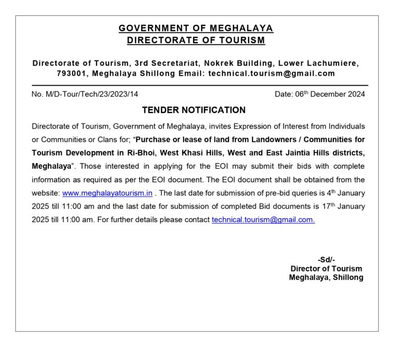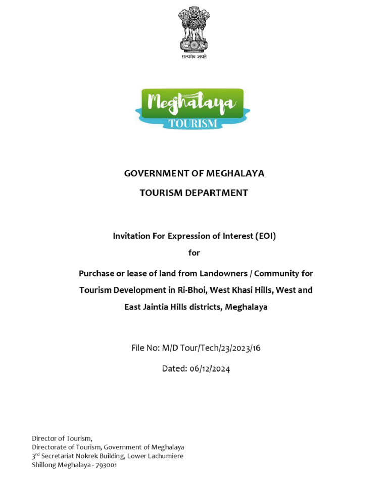 Home » Blog » Expression of Interest (EOI) for Purchase or lease of land from Landowners / Community for Tourism Development in Ri-Bhoi, West Khasi Hills, West and East Jaintia Hills districts